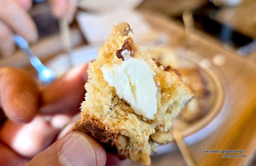 호두가 듬뿍 올라가 씹을수록 고소하고, 위에 얹어진 버터를 곁들이니 풍미를 완성시켜 줍니다.