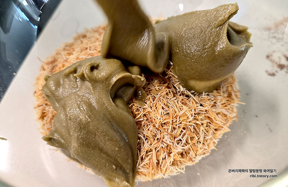 그러는 동안 아들 녀석은 카다이프면과 피스타치로 스프레드를 잘 섞어 줬어요.