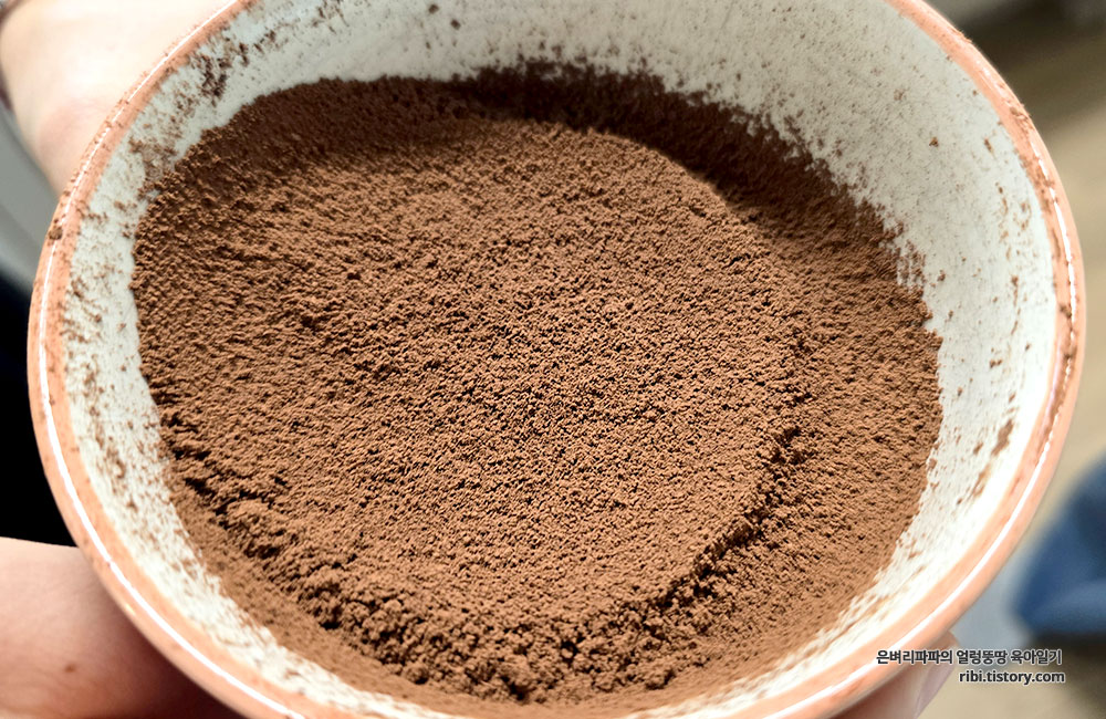 딸아이가 먼저 코코아파우더를 채로 쳤습니다.