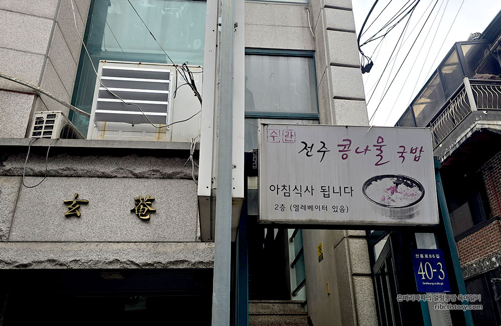 2층에 자리 잡은 '수란 전주콩나물국밥' 간판이 눈에 들어왔습니다.