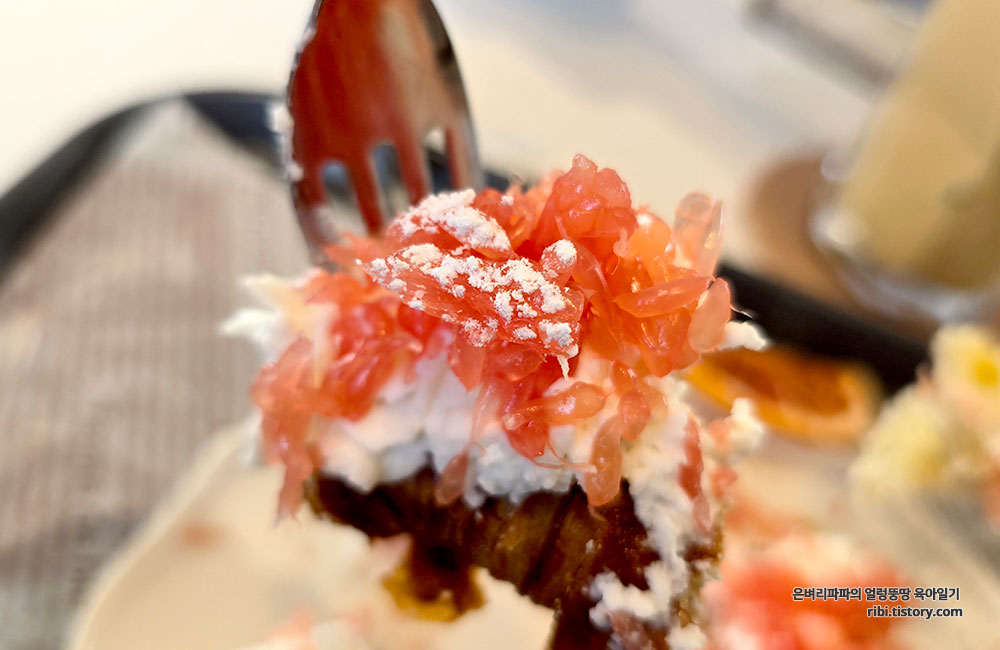 그리고 그 위에 보석처럼 박힌 선홍빛 자몽 과육과 말린 자몽 칩의 조화는 그야말로 예술이었어요.