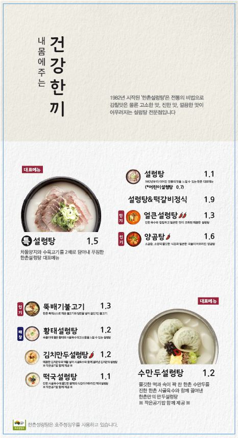 한촌설렁탕의 따뜻한 국물로 기운을 충전해 보세요.