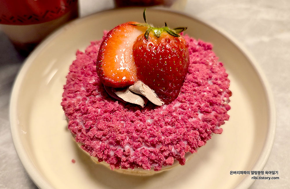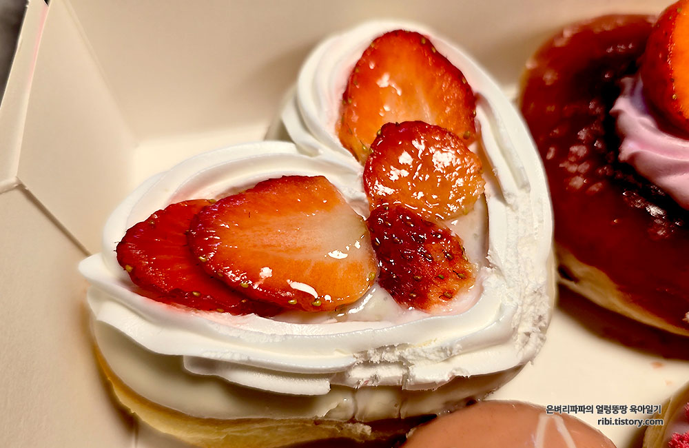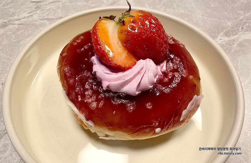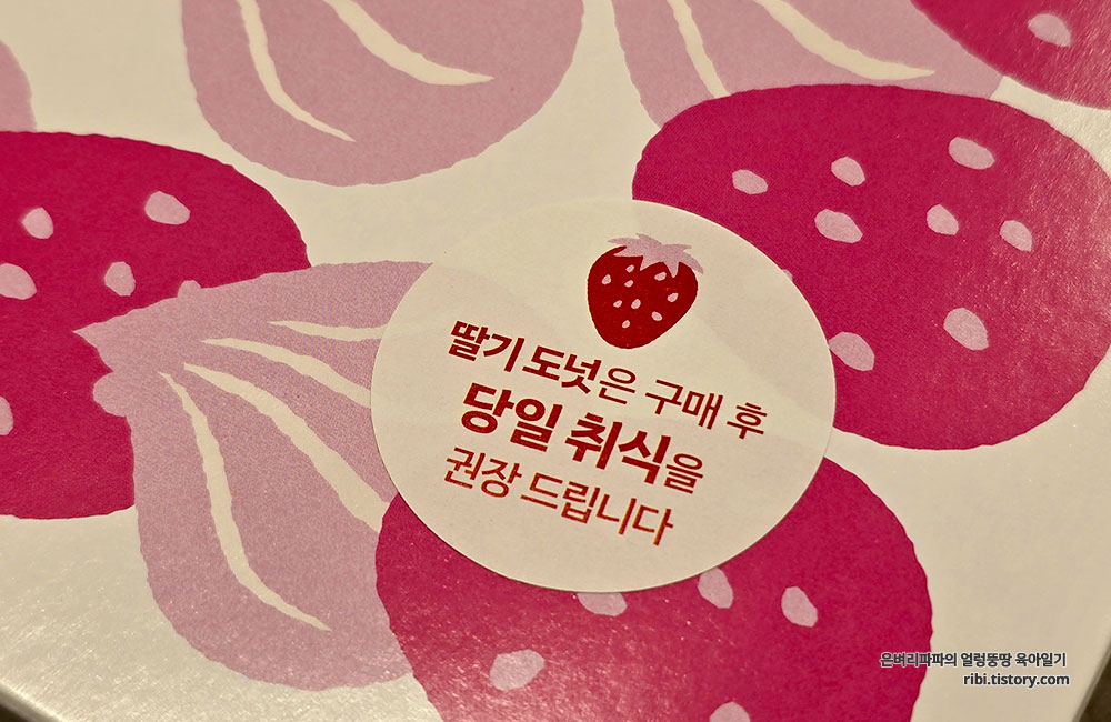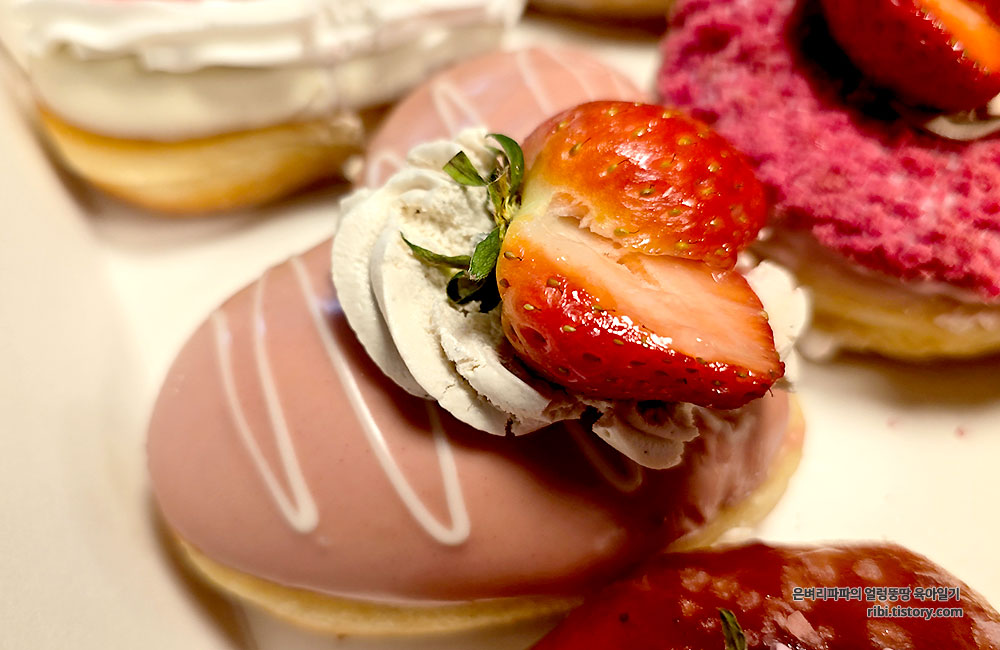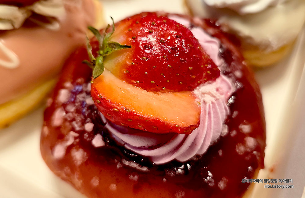 딸기 도넛은 생과일이 올라가 있어 구매 당일 바로 드시는 게 가장 신선하고 맛있습니다.