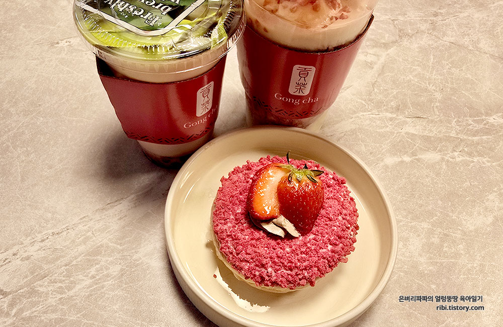 딸이 준비한 공차의 쌉싸름하거나 달콤한 티와 크리스피 한 도넛은