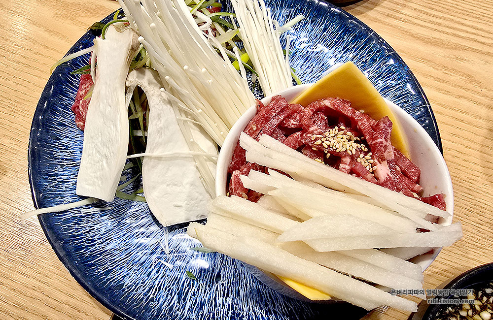 먼저 한우 육회가 포함된 간장 베이스의 서울식 불고기인 유쾌한 불고기가 나왔습니다.
