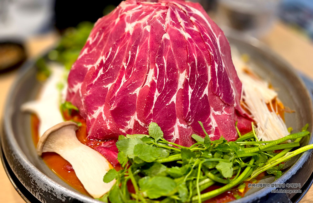 선홍빛 고기가 겹겹이 쌓인 모습은 마치 화산이 푹 발하기 직전의 모습 같았습니다.