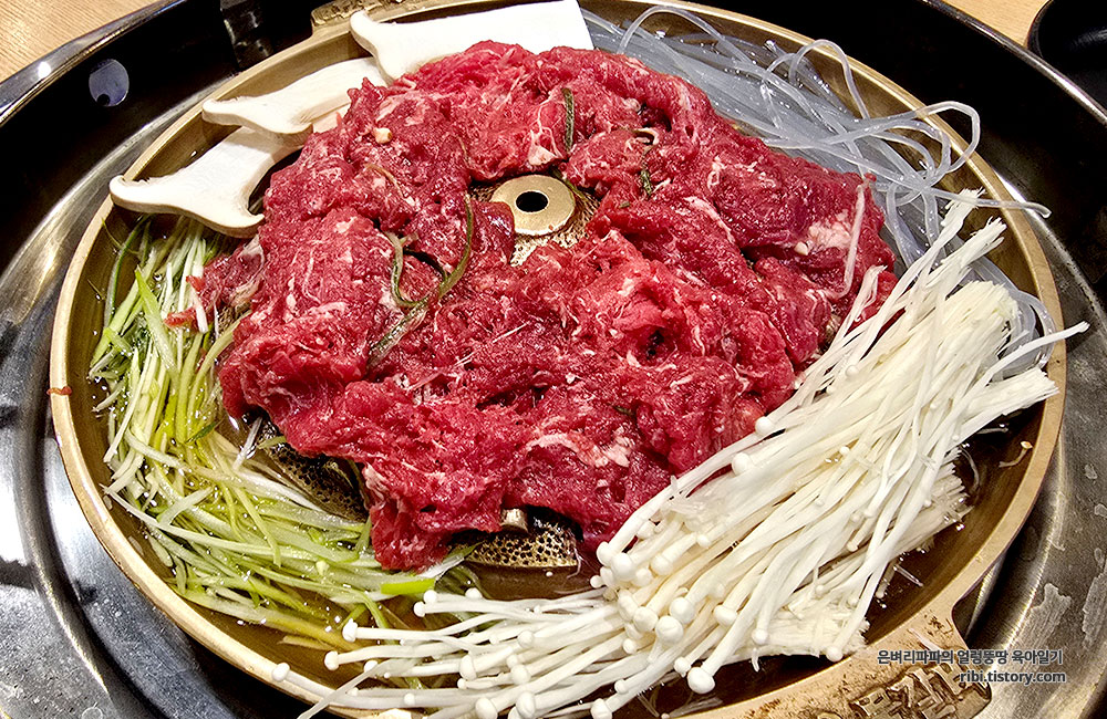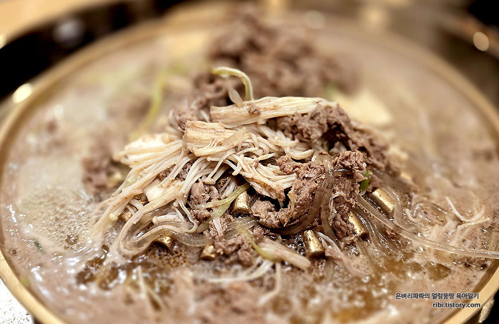 황동 불판 위에서 지글지글 익어가는 부드러운 불고기와 당면의 조합은 언제나 옳죠.