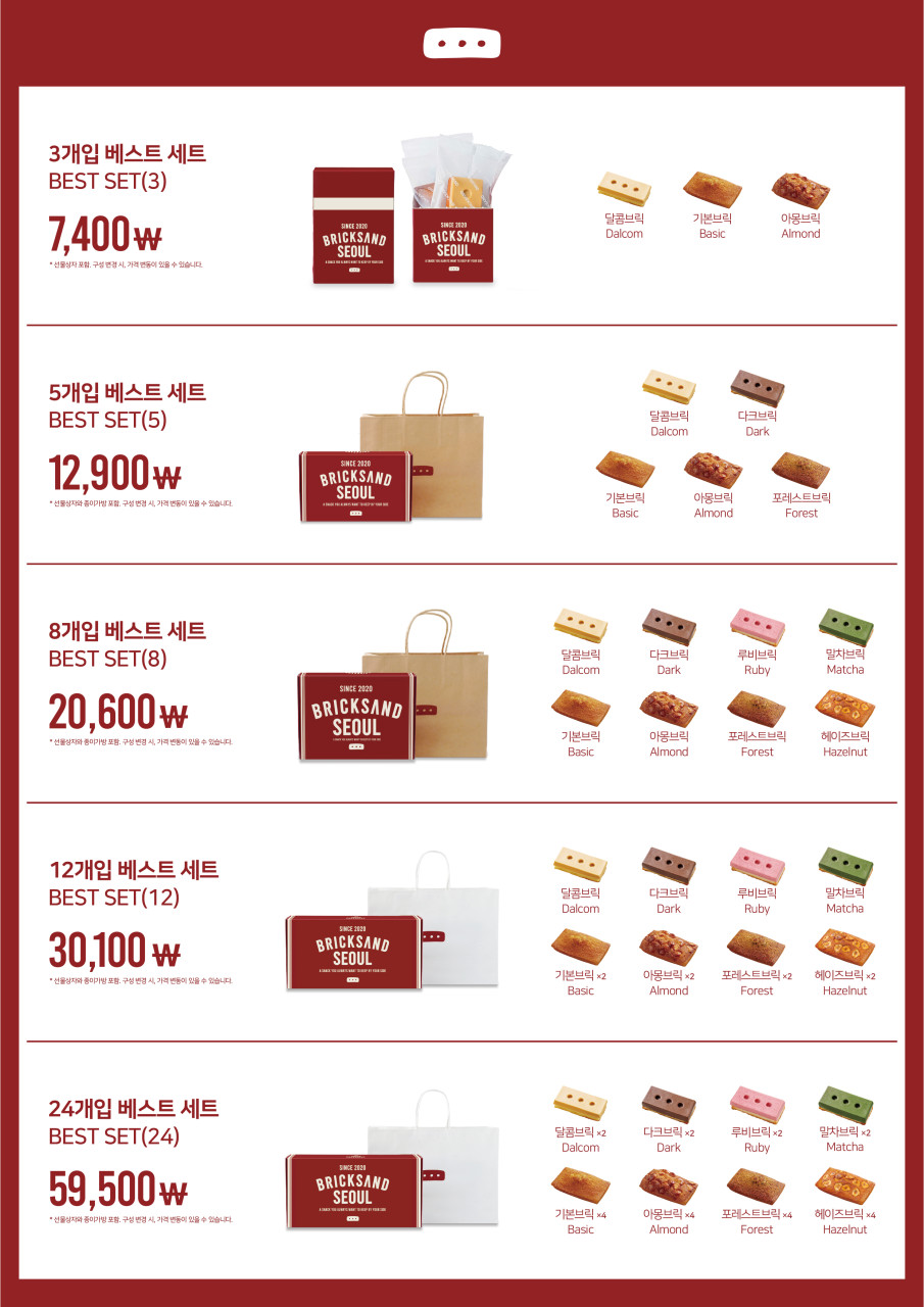 12개 베스트 세트는 브릭샌드의 정체성을 보여주는 시그니처 '브릭'라인과 재료 본연의 풍미를 살린 '구음과자' 라인이 완벽한 밸런스를 이룹니다. 벽돌모양의 초콜릿이 올라간 달콤, 다크, 루비, 말차 4종류의 휘낭시에와 기본맛, 아몽, 헤이즈, 포레스트 휘낭시에가 각 2개씩 들어 있습니다.