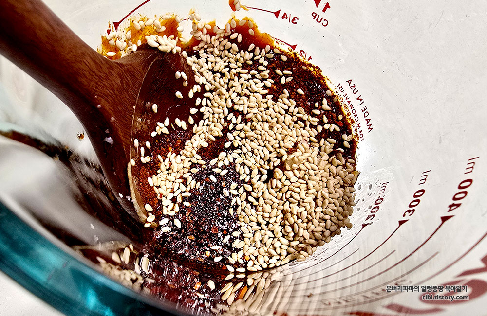 고추장 2, 간장 1, 다진 마늘 0.5, 고춧가루 1, 알룰로스 2, 식초 1, 참기름 1, 참깨 1의 비율로 섞어주세요.