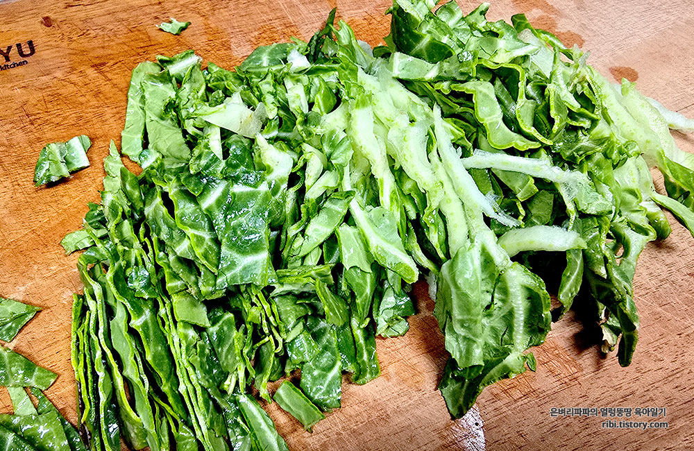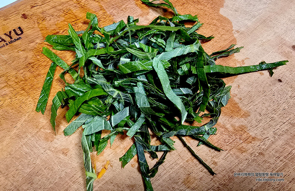 봄동 역시 깨끗하게 씻어 잘게 채 썰어줬습니다.