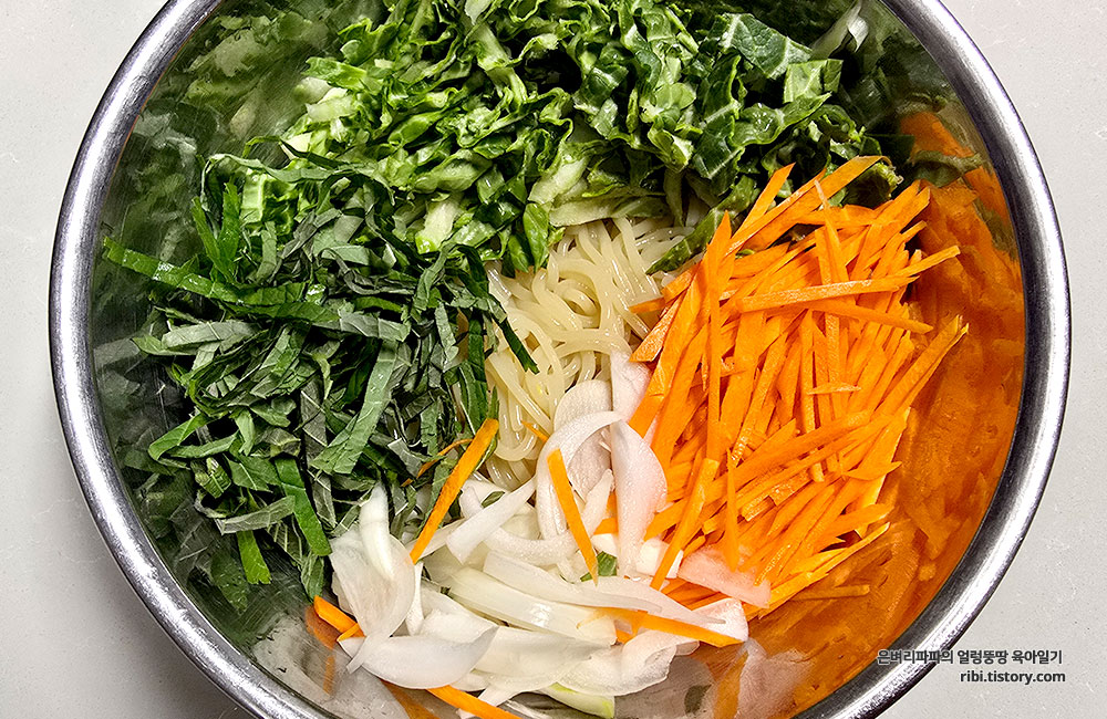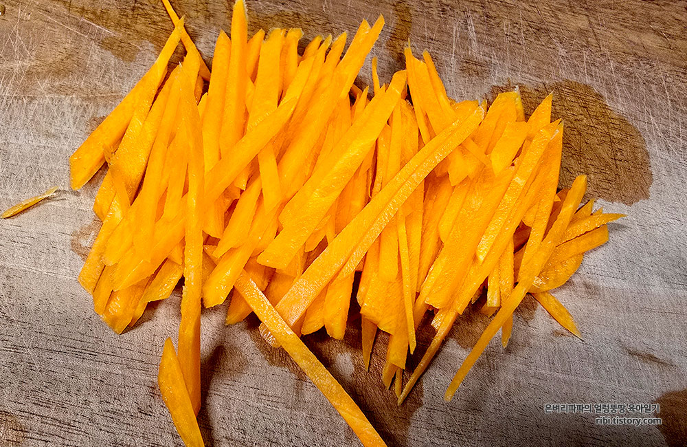 그러는 동안 채소는 먹기 좋은 크기로 채 썰어 준비합니다.