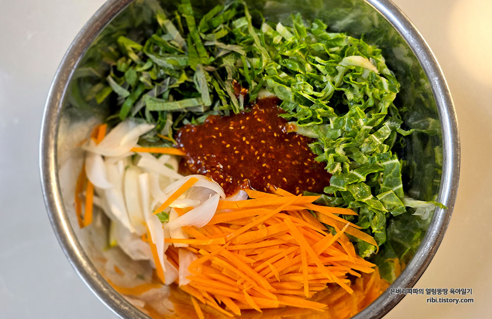 당근, 양파, 깻잎, 봄동을 올리고, 마지막에 양념장을 올려주세요.