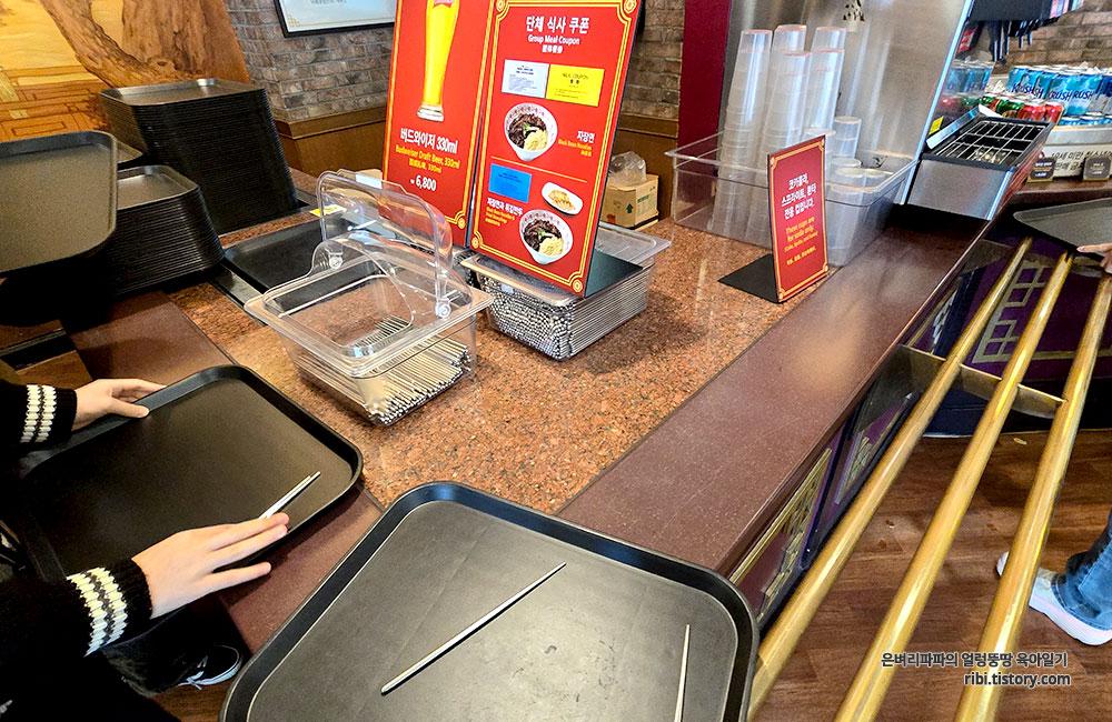 입장 후 줄을 따라 이동하며 쟁반과 젓가락을 먼저 챙깁니다.