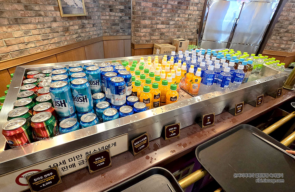 배식대를 지나며 시원한 칭다오 맥주, 주스, 그리고 달콤한 사이드 메뉴등을 직접 쟁반에 담습니다.