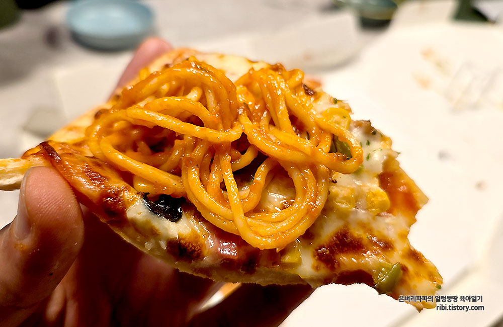 아들이 왜 피자 위에 이 스파게티를 얹었는지 단번에 이해되는 맛이었어요!