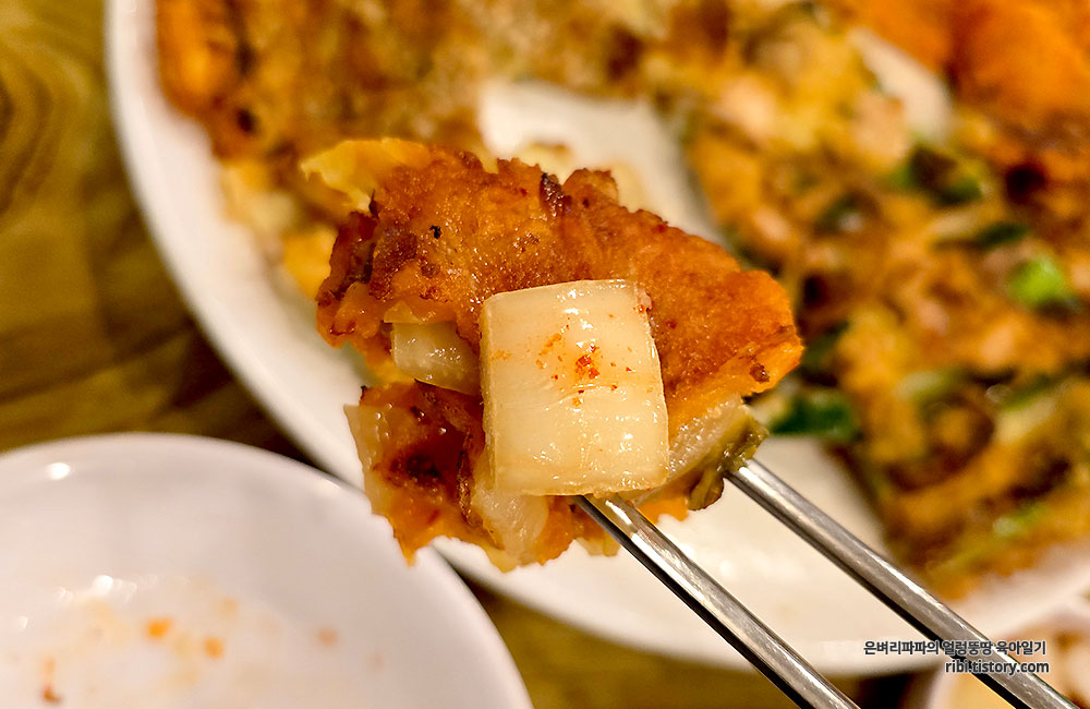 특히 함께 나오는 양파 간장 절임의 아삭한 양파 한 점을 전 위에 올려 먹으면,
