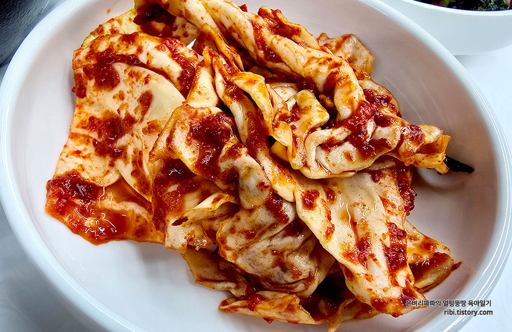 양배추 겉절이의 아삭한 타격감이 더해지니 입안이 금세 산뜻해집니다.