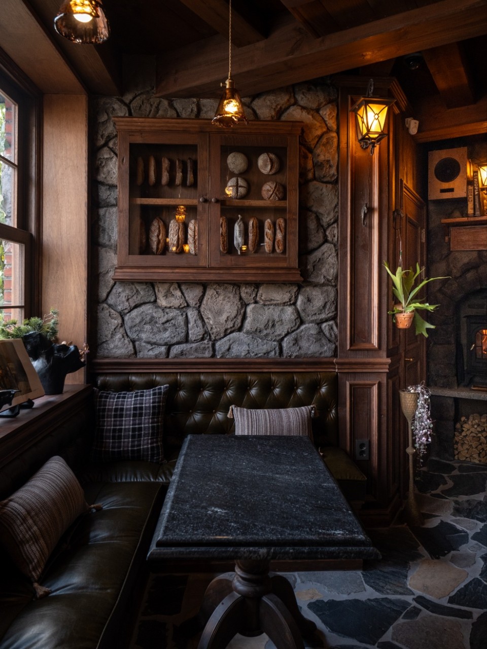 실내는 거대한 서까래와 돌벽, 그리고 타오르는 벽난로가 어우러져