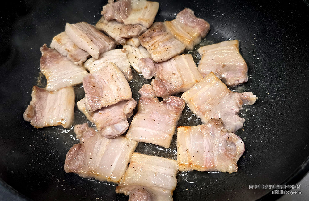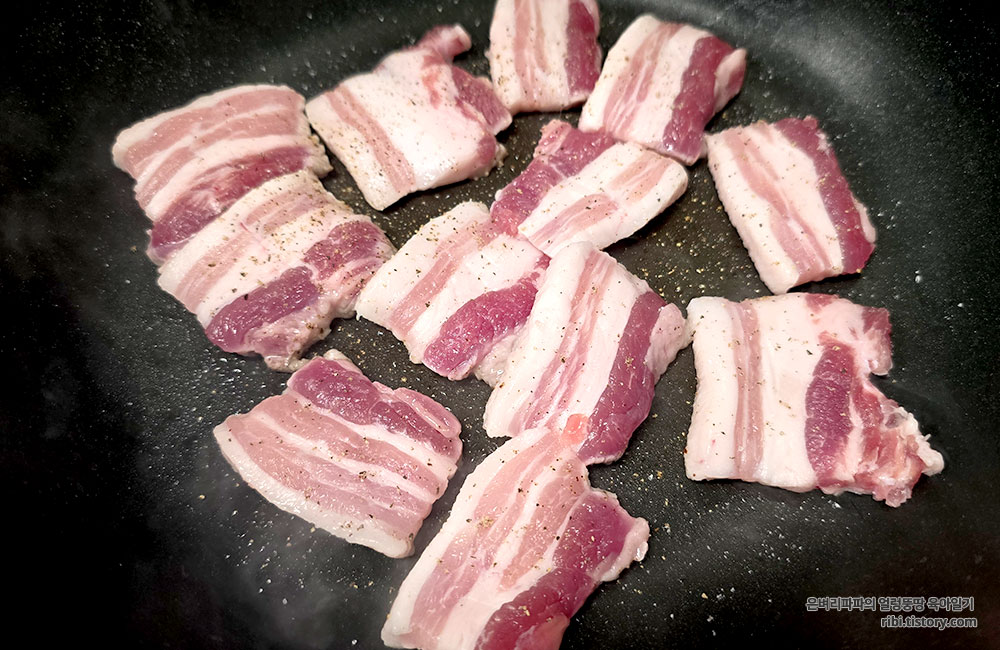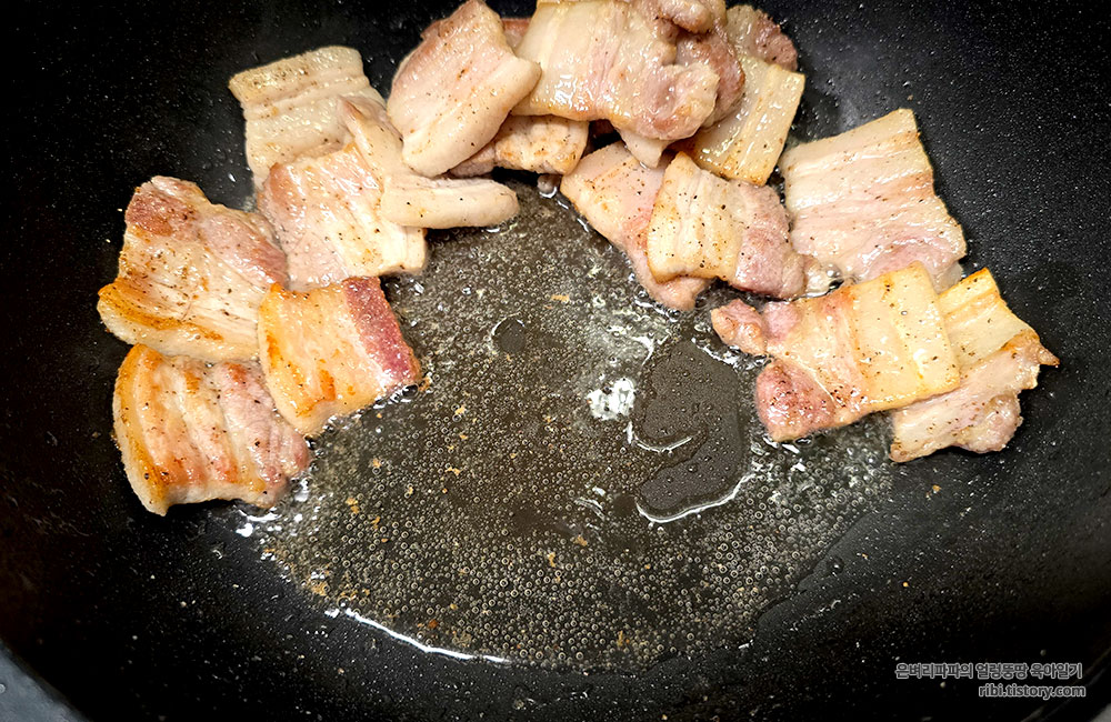 볶음팬에 삼겹살을 먼저 구워주세요.