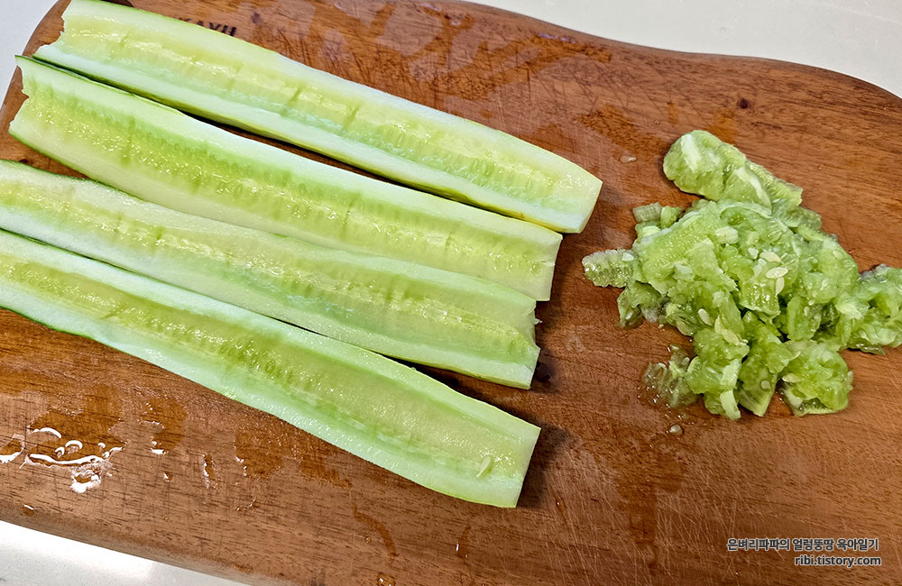 속을 제거한 오이는 반달모양으로 가늘게 썰어 준비합니다.